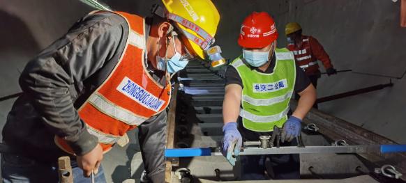 钢轨敷设完成后,需要进行混凝土浇筑,如何将地面拌和站搅拌好的混凝土及时高效地运至场地,成了施工过程中的又一难题。“项目部综合讨论多种方案,最终确定了在地面安装下料管直通井底,并在隧道内配置1台可在隧道内通行的小型罐车和1台小型车载泵,罐车和车载泵的入料口需要相对放置。浇筑过程中,地面罐车混凝土通过下料管卸入井底并由小型罐车接收,此种浇筑方式大大降低车载泵故障率,提高了混凝土的施工质量,更提升了施工效率。”姜军说。